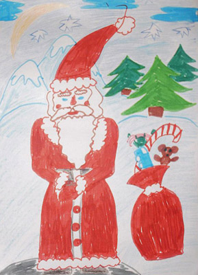 Mama Łucji napisała: Praca została narysowany flamastrami. Warto zwrócić uwagę na piękne i długie rzęsy Mikołaja, a do tego jest on nowoczesny bo prezenty rozwozi na nartach.