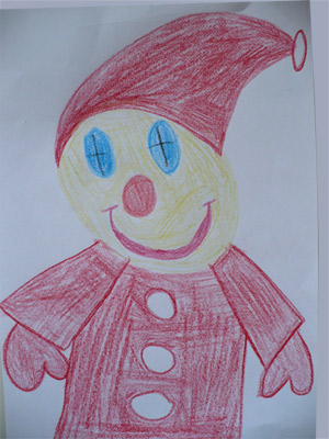 Mama napisała: Pawełek jest straszną gadułą, buzia mu się nie zamyka. Z wielką chęcią zabrał się do malowania farbkami. Podczas robienia sałatki słyszałam z kuchni taki monolog: "Zacznę od czapki, dużej czapki, potem głowa, potem oczy, zrobię mu takie ładne rzęski jakie ma mamusia. Dziwne, że ładne rzęsy tylko ma mama, tata nie ma takich czarnych. Noooos, buzia, jejku, nic mi się więcej nie zmieści. Nie szkodzi, głowa wystarczy, przecież głowa jest najważniejsza, w niej są pomysły..... ja na przykład mam dużo pomysłów, to mam dużą głowę, a Beatka (młodsza siostra) chyba nie ma pomysłów, więc ma małą głowę. Ciekawe czy Beatka już myśli. Mamoooooo, czy Beatka już myśli??????"