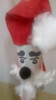 Mama napisała: Mikołaj jest zrobiony z rolki po papierze toaletowym, kawałków czerwonej bibuły i waty. Przyklejając brodę Igorek stwierdził, że to jest Mikołaj tylko dla polskich dzieci bo jest ubrany w kolory, takie jakie ma nasza flaga narodowa. Następnie wymyślił teorię, że Mikołaj przynosi paczki w kolejności wielkości krajów na świecie. Np. najpierw dostają prezenty dzieci z Rosji, potem z Chin itd, aż do najmniejszego kraju. Na koniec stwierdził zadowolony: "Dobrze, że mieszkamy w Polsce, bo mali Czesi muszą dłużej od nas czekać na prezenty!!!"